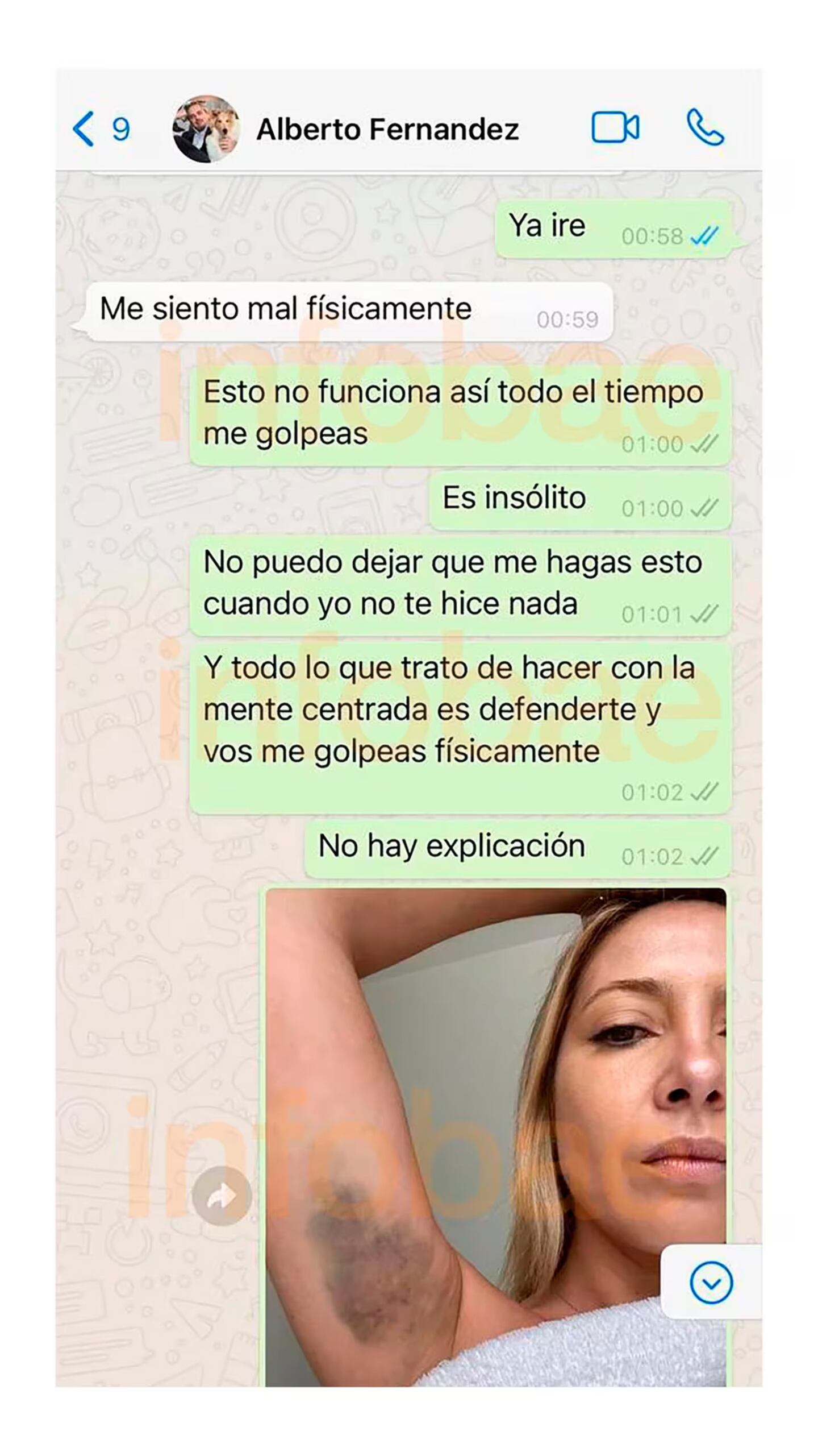 Dos fotografías, en la que aparece Fabiola Yañez con marcas de golpes en un ojo y un brazo, comenzaron a circular el jueves por la noche, en medio del escándalo de la denuncia de la ex primera dama contra el ex presidente Alberto Fernández por violencia de género.